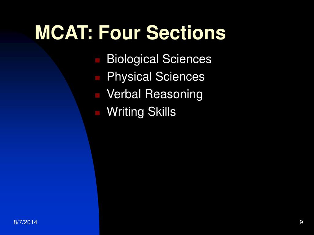 MCAT: Four Sections • Biological Sciences • Physical Sciences • Verbal Reasoning • Writing Skills