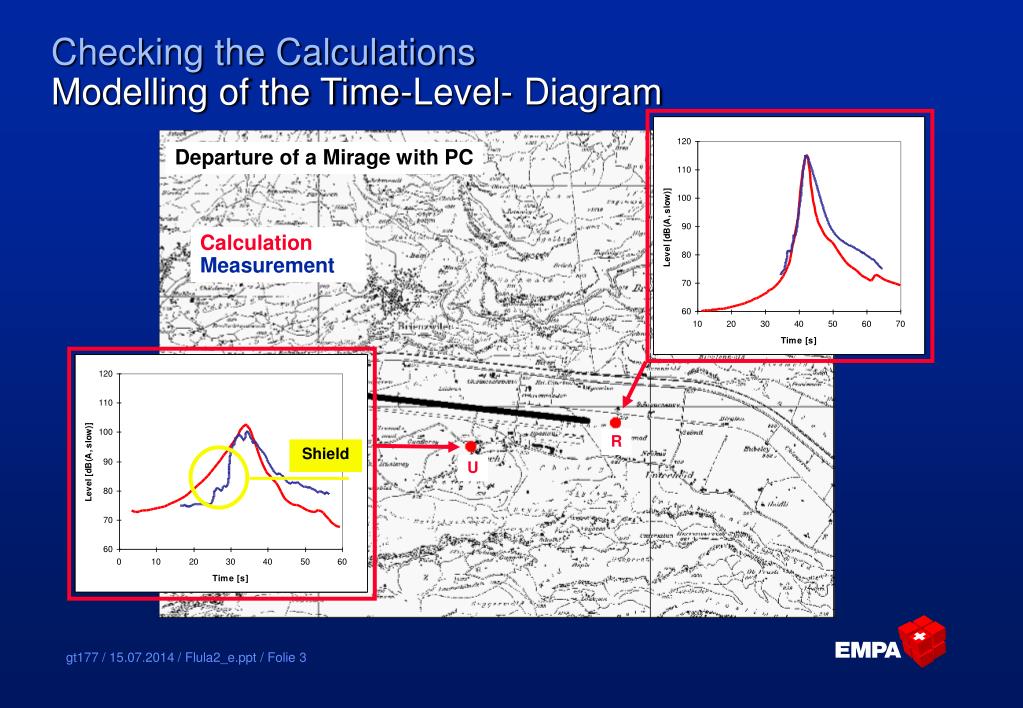 6 7 Checking the Calculation FLULA2 yields a good agreement with mea-surements (deviation of less than 1 dB) in pre-dicting the noise impact at the monitoring stations 6 and 7 in Zürich Kloten. Nevertheless, the question remains open as to whether this is the real impact!