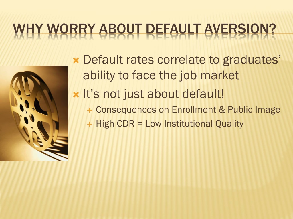 Default rates correlate to graduates’ ability to face the job market • It’s not just about default! • Consequences on Enrollment & Public Image • High CDR = Low Institutional Quality Why worry about default aversion?
