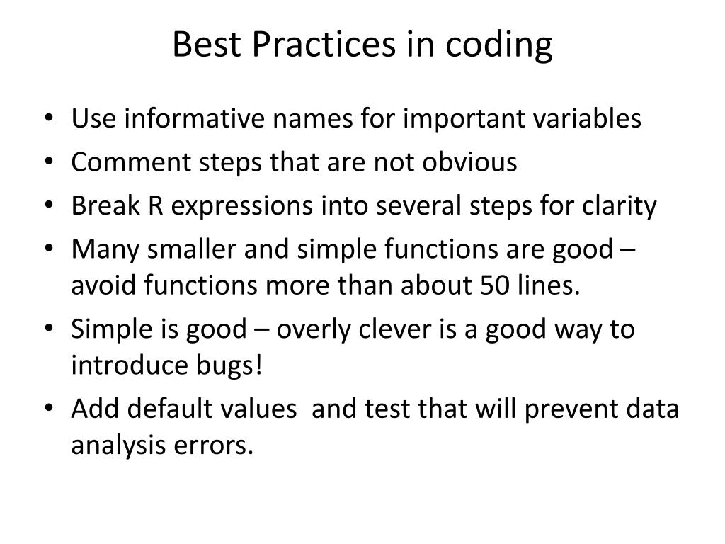 Best Practices in coding • Use informative names for important variables • Comment steps that are not obvious • Break R expressions into several steps for clarity • Many smaller and simple functions are good– avoid functions more than about 50 lines. • Simple is good – overly clever is a good way to introduce bugs! • Add default values and test that will prevent data analysis errors.