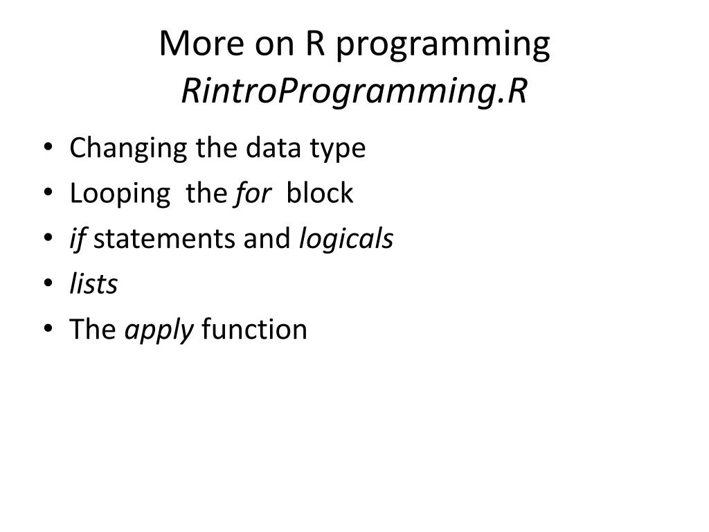 More on R programmingRintroProgramming.R • Changing the data type • Looping the for block • if statements and logicals • lists • The apply function