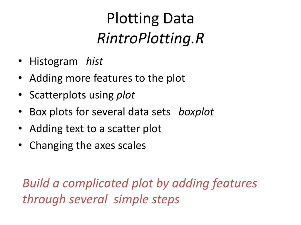 Plotting DataRintroPlotting.R • Histogram hist • Adding more features to the plot • Scatterplots using plot • Box plots for several data sets boxplot • Adding text to a scatter plot • Changing the axes scales Build a complicated plot by adding features through several simple steps