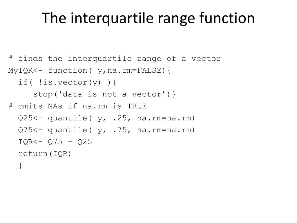 The interquartile range function # finds the interquartile range of a vector MyIQR<- function( y,na.rm=FALSE){ if( !is.vector(y) ){ stop(‘data is not a vector’)} # omits NAs if na.rm is TRUE Q25<- quantile( y, .25, na.rm=na.rm) Q75<- quantile( y, .75, na.rm=na.rm) IQR<- Q75 – Q25 return(IQR) }