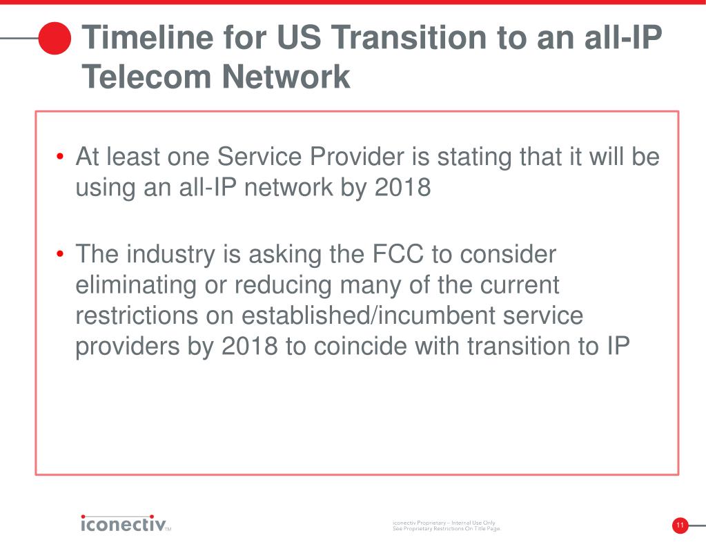 Timeline for US Transition to an all-IP Telecom Network • At least one Service Provider is stating that it will be using an all-IP network by 2018 • The industry is asking the FCC to consider eliminating or reducing many of the current restrictions on established/incumbent service providers by 2018 to coincide with transition to IP