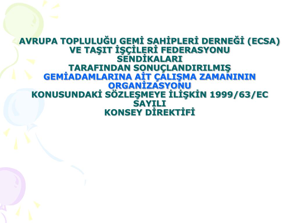AVRUPA TOPLULUĞU GEMİ SAHİPLERİ DERNEĞİ (ECSA) VE TAŞIT İŞÇİLERİ FEDERASYONU SENDİKALARI TARAFINDAN SONUÇLANDIRILMIŞ GEMİADAMLARINA AİT ÇALIŞMA ZAMANININ ORGANİZASYONUKONUSUNDAKİ SÖZLEŞMEYE İLİŞKİN 1999/63/EC SAYILIKONSEY DİREKTİFİ
