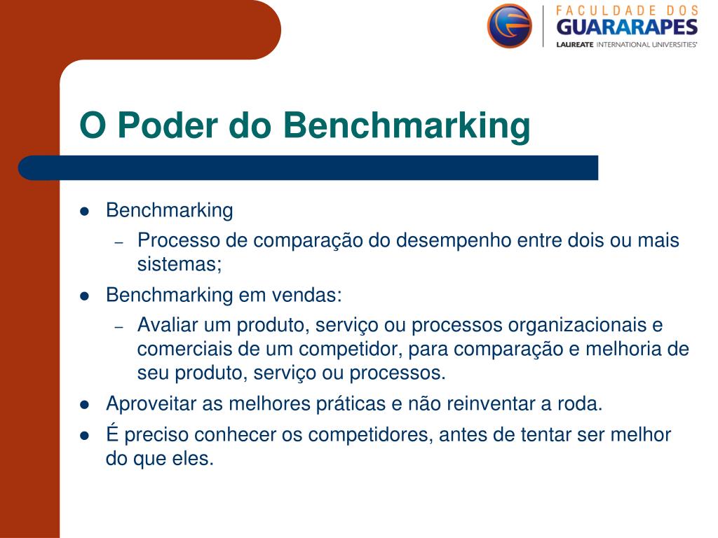 O Poder do Benchmarking Benchmarking Processo de comparação do desempenho entre dois ou mais sistemas; Benchmarking em vendas: Avaliar um produto, serviço ou processos organizacionais e comerciais de um competidor, para comparação e melhoria de seu produto, serviço ou processos. Aproveitar as melhores práticas e não reinventar a roda. É preciso conhecer os competidores, antes de tentar ser melhor do que eles.