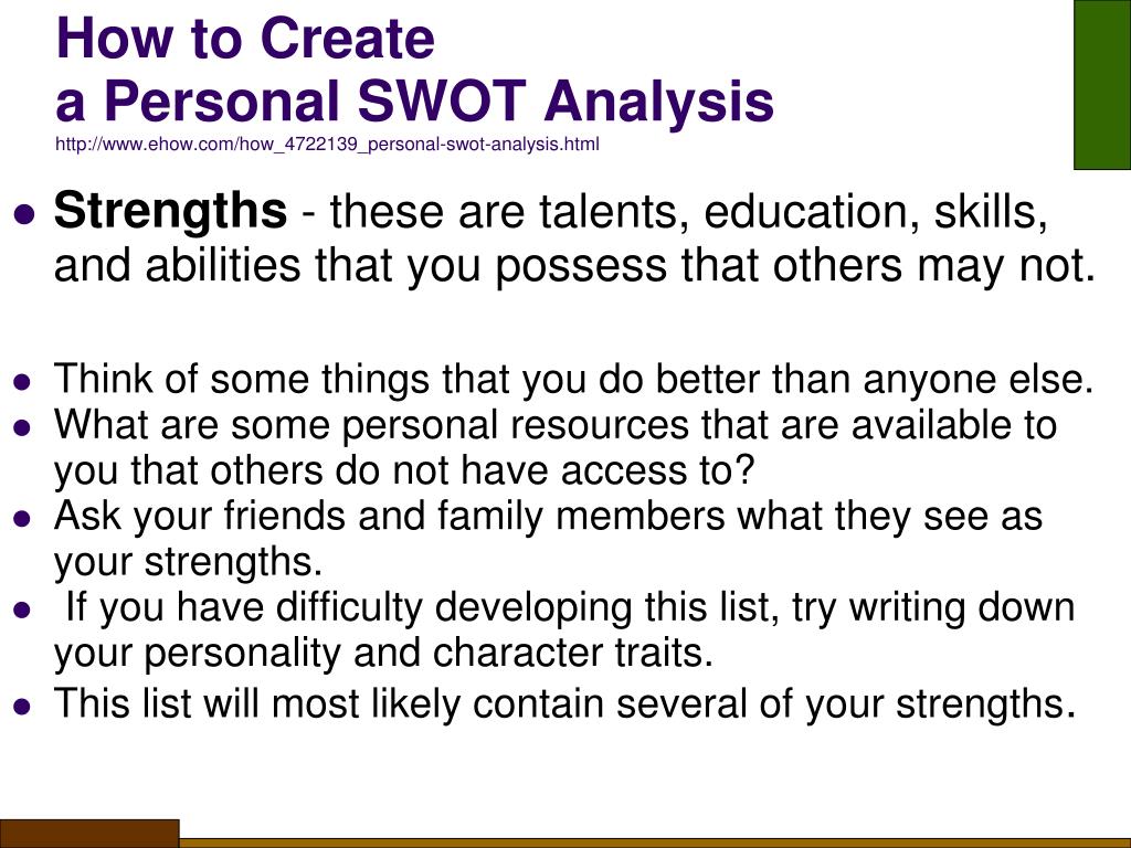 How to Create a Personal SWOT Analysishttp://www.ehow.com/how_4722139_personal-swot-analysis.html • Strengths - these are talents, education, skills, and abilities that you possess that others may not. • Think of some things that you do better than anyone else. • What are some personal resources that are available to you that others do not have access to? • Ask your friends and family members what they see as your strengths. • If you have difficulty developing this list, try writing down your personality and character traits. • This list will most likely contain several of your strengths.
