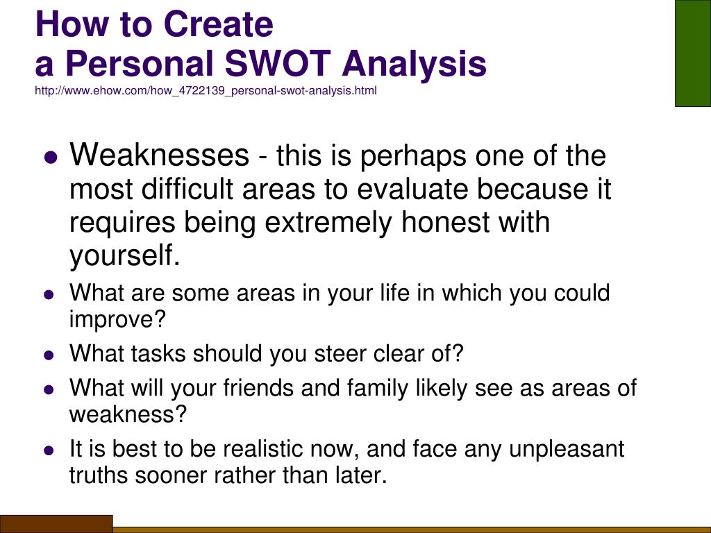 How to Create a Personal SWOT Analysishttp://www.ehow.com/how_4722139_personal-swot-analysis.html • Weaknesses - this is perhaps one of the most difficult areas to evaluate because it requires being extremely honest with yourself. • What are some areas in your life in which you could improve? • What tasks should you steer clear of? • What will your friends and family likely see as areas of weakness? • It is best to be realistic now, and face any unpleasant truths sooner rather than later.