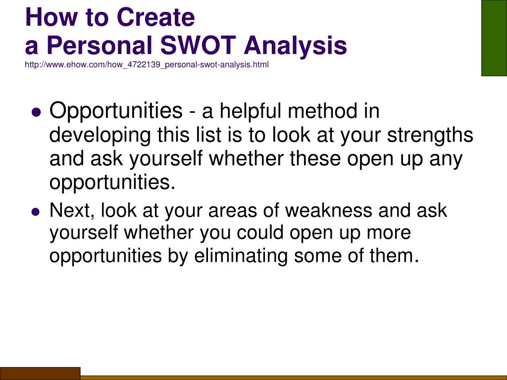 How to Create a Personal SWOT Analysishttp://www.ehow.com/how_4722139_personal-swot-analysis.html • Opportunities - a helpful method in developing this list is to look at your strengths and ask yourself whether these open up any opportunities. • Next, look at your areas of weakness and ask yourself whether you could open up more opportunities by eliminating some of them.