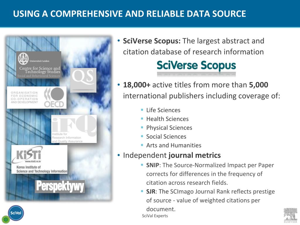 SciVerse Scopus: The largest abstract and citation database of research information 18,000+ active titles from more than 5,000 international publishers including coverage of: Life Sciences Health Sciences Physical Sciences Social Sciences Arts and Humanities Independent journal metrics SNIP: The Source-Normalized Impact per Paper corrects for differences in the frequency of citation across research fields. SJR: The SCImago Journal Rank reflects prestige of source - value of weighted citations per document. USING A COMPREHENSIVE AND RELIABLE DATA SOURCE