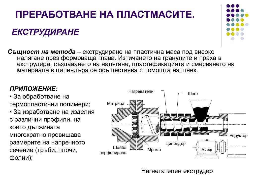 Нагреватели Шнек Матрица Нагнетателен екструдер Редуктор Цилиндър Шайба перфорирана Мрежа Мотор ПРЕРАБОТВАНЕ НА ПЛАСТМАСИТЕ. ЕКСТРУДИРАНЕ Същност на метода – екструдиране на пластична маса под високо налягане през формоваща глава. Изтичането на гранулите и праха в екструдера, създаването на налягане, пластификацията и смесването на материала в цилиндъра се осъществява с помощта на шнек. • ПРИЛОЖЕНИЕ: • За обработване на термопластични полимери; • За изработване на изделия с различни профили, на които дължината многократно превишава размерите на напречното сечение (тръби, плочи, фолии);