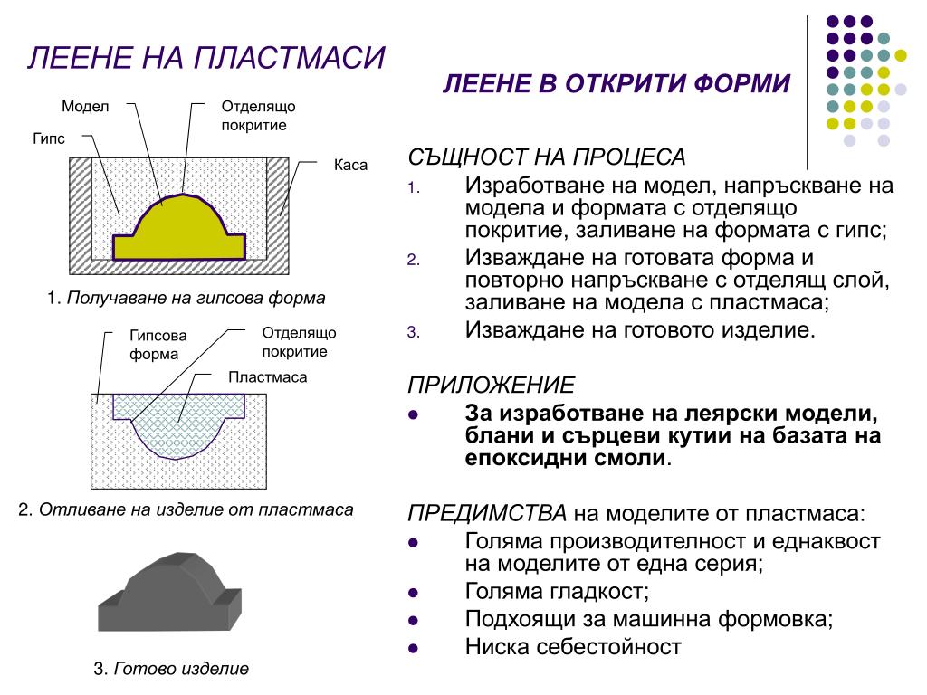 Модел Отделящо покритие Гипс Каса 1. Получаване на гипсова форма Отделящо покритие Гипсова форма Пластмаса 2. Отливане на изделие от пластмаса 3. Готово изделие ЛЕЕНЕ НА ПЛАСТМАСИ ЛЕЕНЕ В ОТКРИТИ ФОРМИ СЪЩНОСТ НА ПРОЦЕСА • Изработване на модел, напръскване на модела и формата с отделящо покритие, заливане на формата с гипс; • Изваждане на готовата форма и повторно напръскване с отделящ слой, заливане на модела с пластмаса; • Изваждане на готовото изделие. ПРИЛОЖЕНИЕ • За изработване на леярски модели, блани и сърцеви кутии на базата на епоксидни смоли. ПРЕДИМСТВА на моделите от пластмаса: • Голяма производителност и еднаквост на моделите от една серия; • Голяма гладкост; • Подхоящи за машинна формовка; • Ниска себестойност
