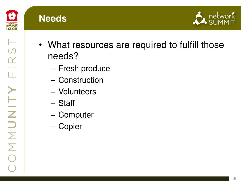 Needs • What resources are required to fulfill those needs? • Fresh produce • Construction • Volunteers • Staff • Computer • Copier