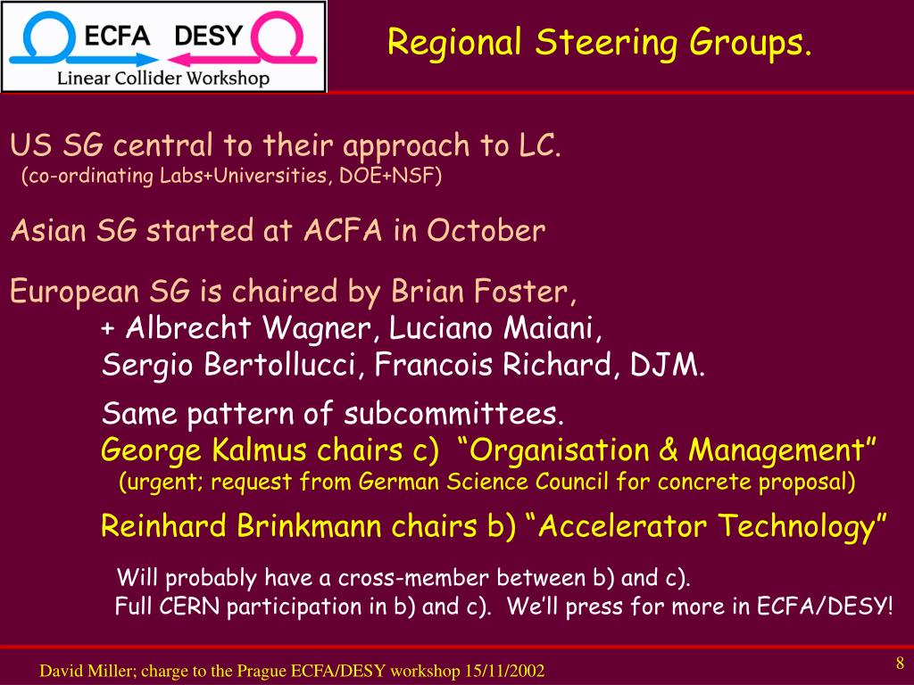 Regional Steering Groups. US SG central to their approach to LC. (co-ordinating Labs+Universities, DOE+NSF) Asian SG started at ACFA in October European SG is chaired by Brian Foster, + Albrecht Wagner, Luciano Maiani, Sergio Bertollucci, Francois Richard, DJM. Same pattern of subcommittees. George Kalmus chairs c) “Organisation & Management” (urgent; request from German Science Council for concrete proposal) Reinhard Brinkmann chairs b) “Accelerator Technology” Will probably have a cross-member between b) and c). Full CERN participation in b) and c). We’ll press for more in ECFA/DESY!