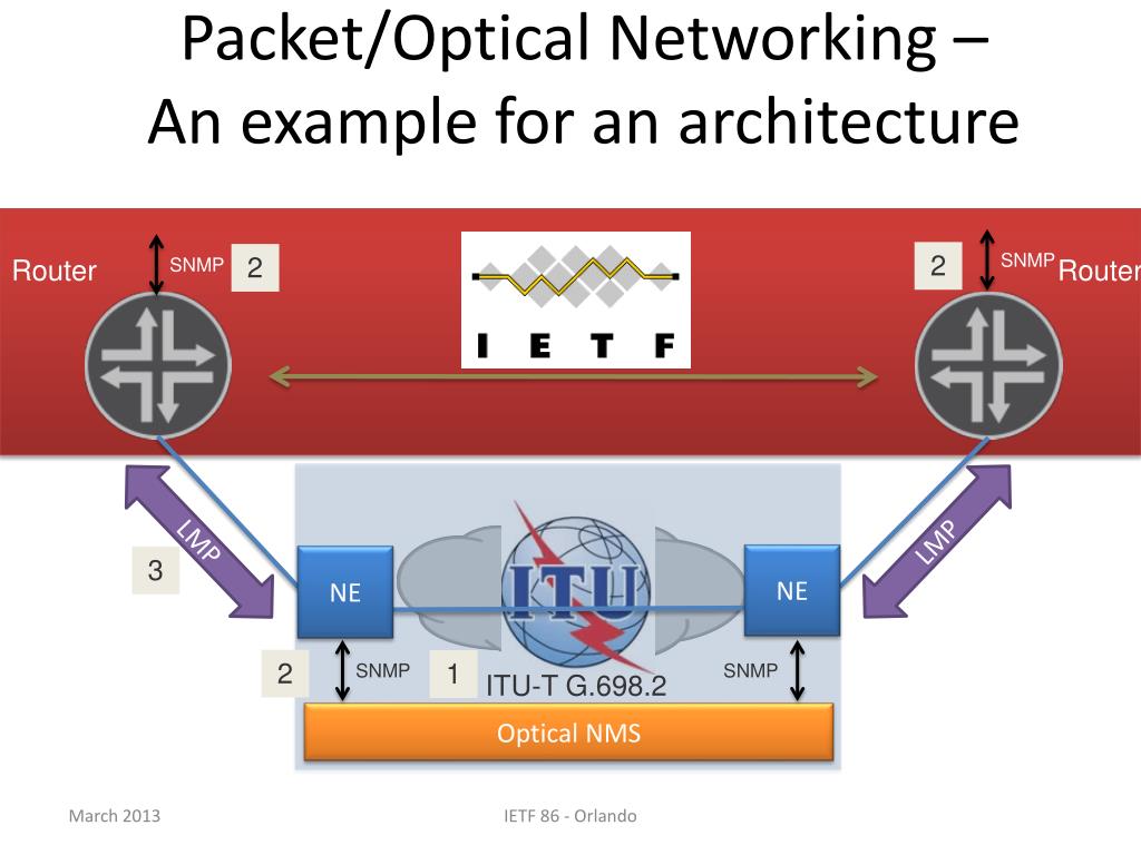 Packet/Optical Networking –An example for an architecture 2 SNMP 2 Router Router SNMP MPLS LMP LMP NE NE 3 2 1 SNMP SNMP ITU-T G.698.2 Optical NMS IETF 86 - Orlando
