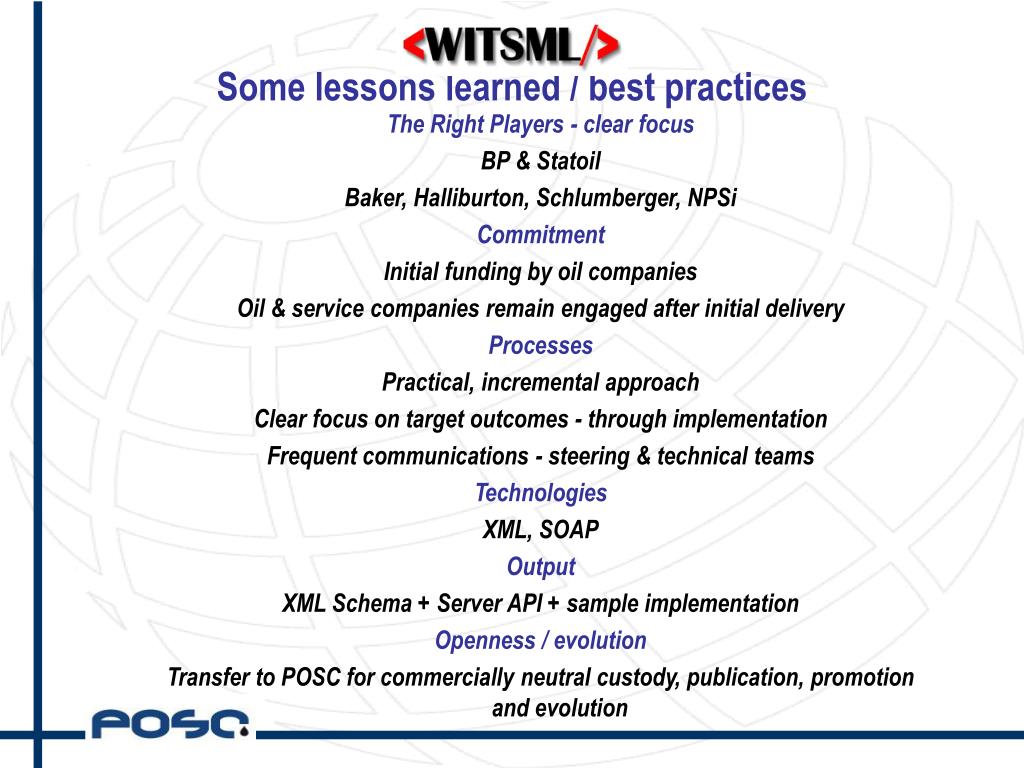 The Right Players - clear focus BP & Statoil Baker, Halliburton, Schlumberger, NPSi Commitment Initial funding by oil companies Oil & service companies remain engaged after initial delivery Processes Practical, incremental approach Clear focus on target outcomes - through implementation Frequent communications - steering & technical teams Technologies XML, SOAP Output XML Schema + Server API + sample implementation Openness / evolution Transfer to POSC for commercially neutral custody, publication, promotion and evolution Some lessons learned / best practices