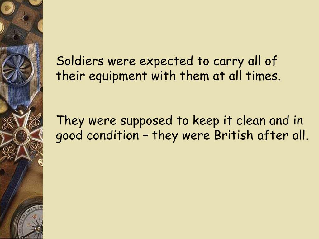 Soldiers were expected to carry all of their equipment with them at all times. They were supposed to keep it clean and in good condition – they were British after all.