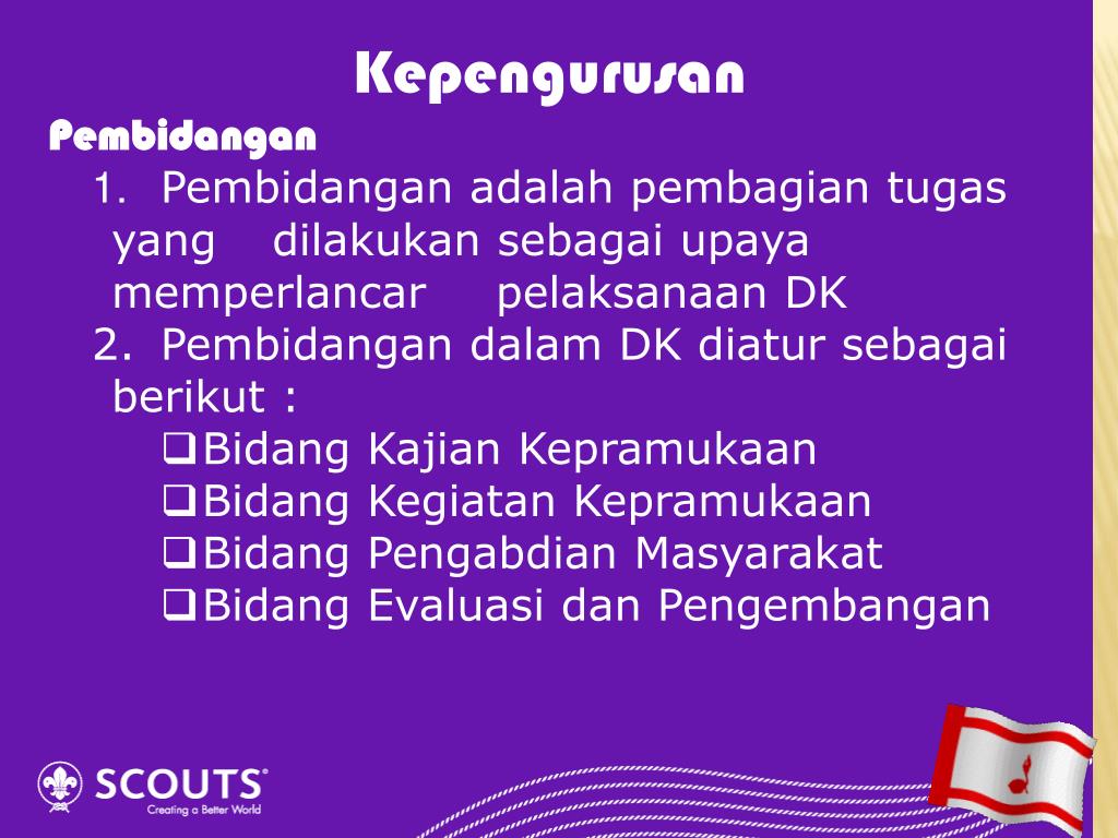Kepengurusan • Pembidangan • Pembidangan adalah pembagian tugas yang dilakukan sebagai upaya memperlancar pelaksanaan DK • Pembidangan dalam DK diatur sebagai berikut : • Bidang Kajian Kepramukaan • Bidang Kegiatan Kepramukaan • Bidang Pengabdian Masyarakat • Bidang Evaluasi dan Pengembangan