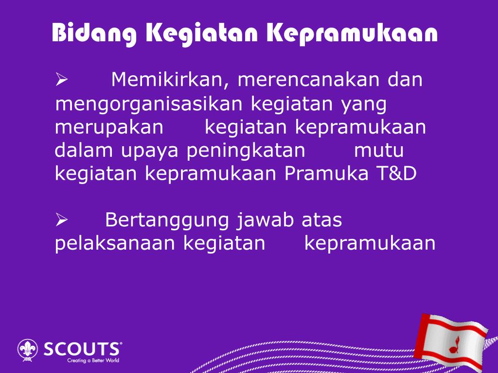 Bidang Kegiatan Kepramukaan • Memikirkan, merencanakan dan mengorganisasikan kegiatan yang merupakan kegiatan kepramukaan dalam upaya peningkatan mutu kegiatan kepramukaan Pramuka T&D • Bertanggung jawab atas pelaksanaan kegiatan kepramukaan