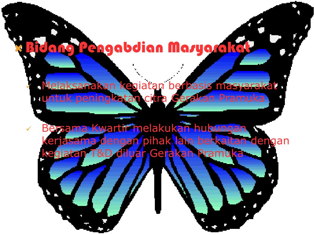 Bidang Pengabdian Masyarakat • Melaksanakan kegiatan berbasis masyarakat untuk peningkatan citra Gerakan Pramuka • Bersama Kwartir melakukan hubungan kerjasama dengan pihak lain berkaitan dengan kegiatan T&D diluar Gerakan Pramuka