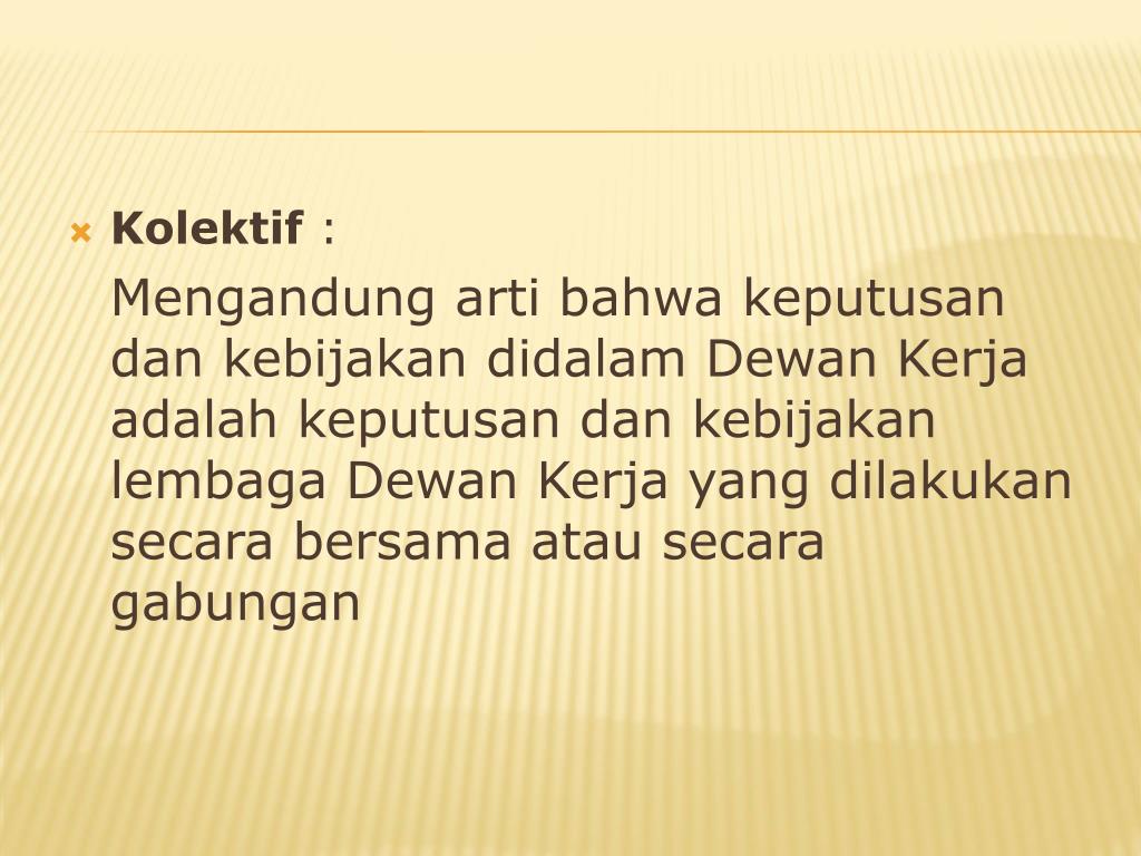 Kolektif : Mengandung arti bahwa keputusan dan kebijakan didalam Dewan Kerja adalah keputusan dan kebijakan lembaga Dewan Kerja yang dilakukan secara bersama atau secara gabungan