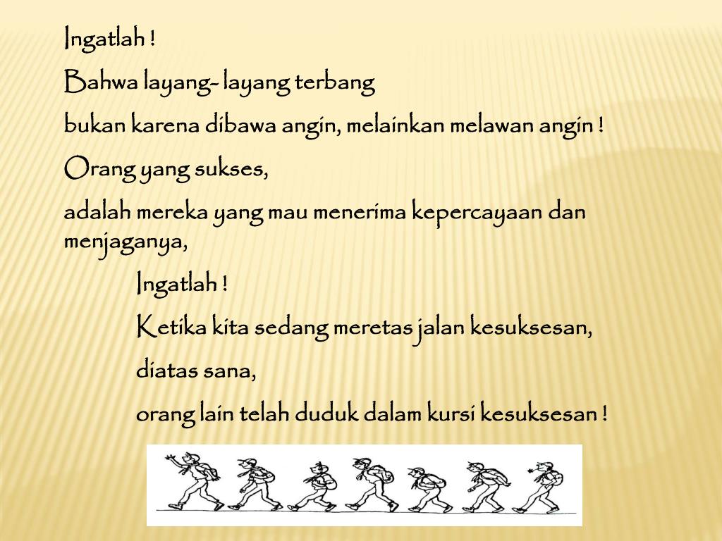 Ingatlah ! Bahwa layang- layang terbang bukan karena dibawa angin, melainkan melawan angin ! Orang yang sukses, adalah mereka yang mau menerima kepercayaan dan menjaganya, Ingatlah ! Ketika kita sedang meretas jalan kesuksesan, diatas sana, orang lain telah duduk dalam kursi kesuksesan !