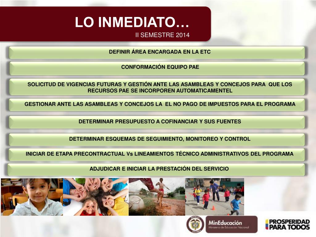 DEFINIR ÁREA ENCARGADA EN LA ETC CONFORMACIÓN EQUIPO PAE SOLICITUD DE VIGENCIAS FUTURAS Y GESTIÓN ANTE LAS ASAMBLEAS Y CONCEJOS PARA QUE LOS RECURSOS PAE SE INCORPOREN AUTOMATICAMENTEL GESTIONAR ANTE LAS ASAMBLEAS Y CONCEJOS LA EL NO PAGO DE IMPUESTOS PARA EL PROGRAMA LO INMEDIATO… II SEMESTRE 2014 DETERMINAR PRESUPUESTO A COFINANCIAR Y SUS FUENTES DETERMINAR ESQUEMAS DE SEGUIMIENTO, MONITOREO Y CONTROL INICIAR DE ETAPA PRECONTRACTUAL Vs LINEAMIENTOS TÉCNICO ADMINISTRATIVOS DEL PROGRAMA ADJUDICAR E INICIAR LA PRESTACIÓN DEL SERVICIO
