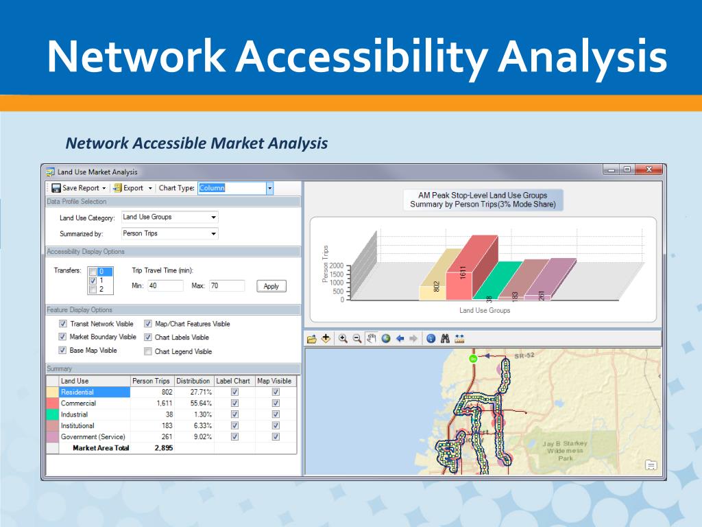 Network Accessibility Analysis • Combines TBEST transit networking origin/destination capabilities with market and model results to produce an interactive summarization of network accessible markets and model output • Network Accessibility Build - core of the accessibility calculation which populates an origin/destination matrix for each stop in the network • Summarizes both outflow and inflow markets and ridership from a selected stop, multiple stops or from a geographic area by time of day • Filter results by trip time and number of transfers