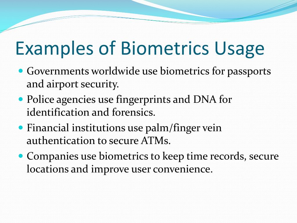 Examples of Biometrics Usage • Governments worldwide use biometrics for passports and airport security. • Police agencies use fingerprints and DNA for identification and forensics. • Financial institutions use palm/finger vein authentication to secure ATMs. • Companies use biometrics to keep time records, secure locations and improve user convenience.