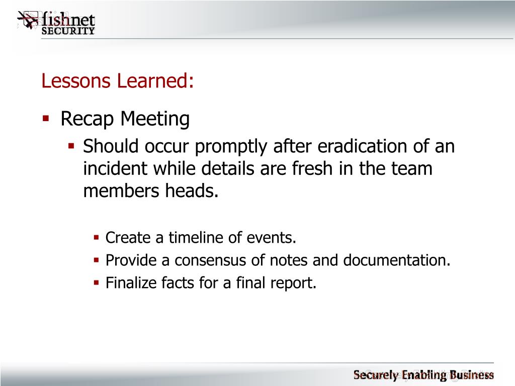Lessons Learned: • Recap Meeting • Should occur promptly after eradication of an incident while details are fresh in the team members heads. • Create a timeline of events. • Provide a consensus of notes and documentation. • Finalize facts for a final report.