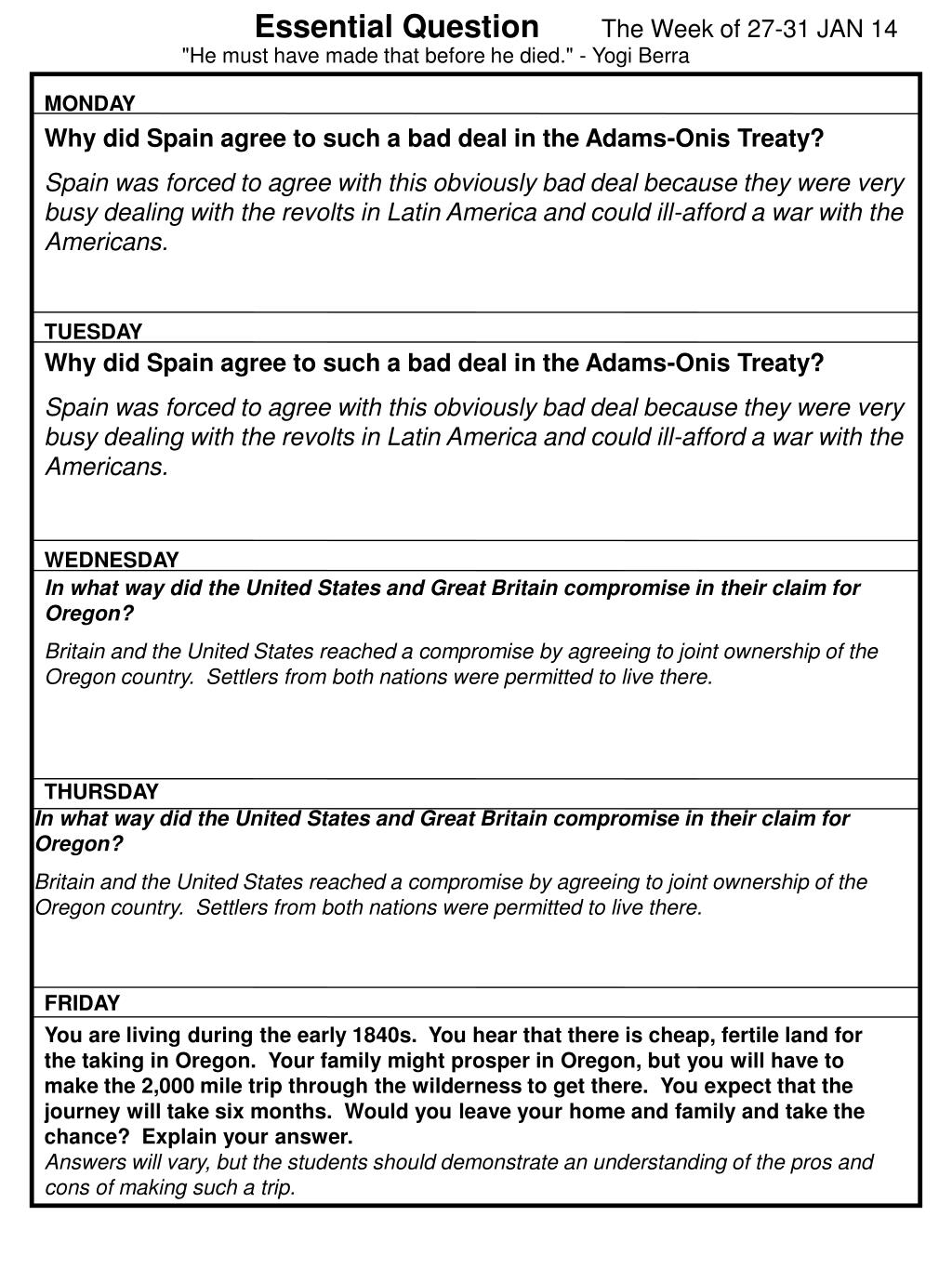 Essential QuestionThe Week of 27-31 JAN 14 "He must have made that before he died." - Yogi Berra MONDAY Why did Spain agree to such a bad deal in the Adams-Onis Treaty? TUESDAY Why did Spain agree to such a bad deal in the Adams-Onis Treaty? WEDNESDAY In what way did the United States and Great Britain compromise in their claim for Oregon? THURSDAY In what way did the United States and Great Britain compromise in their claim for Oregon? FRIDAY You are living during the early 1840s. You hear that there is cheap, fertile land for the taking in Oregon. Your family might prosper in Oregon, but you will have to make the 2,000 mile trip through the wilderness to get there. You expect that the journey will take six months. Would you leave your home and family and take the chance? Explain your answer. Why did the Puritans want to leave the Netherlands?