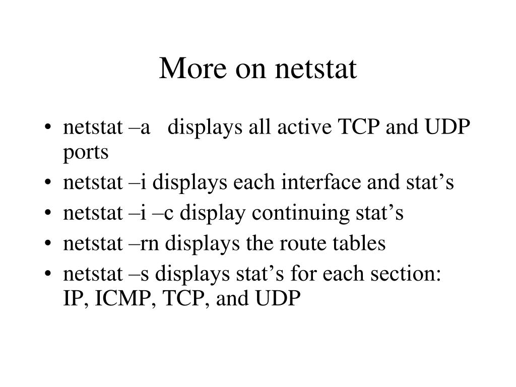 More on netstat • netstat –a displays all active TCP and UDP ports • netstat –i displays each interface and stat’s • netstat –i –c display continuing stat’s • netstat –rn displays the route tables • netstat –s displays stat’s for each section: IP, ICMP, TCP, and UDP