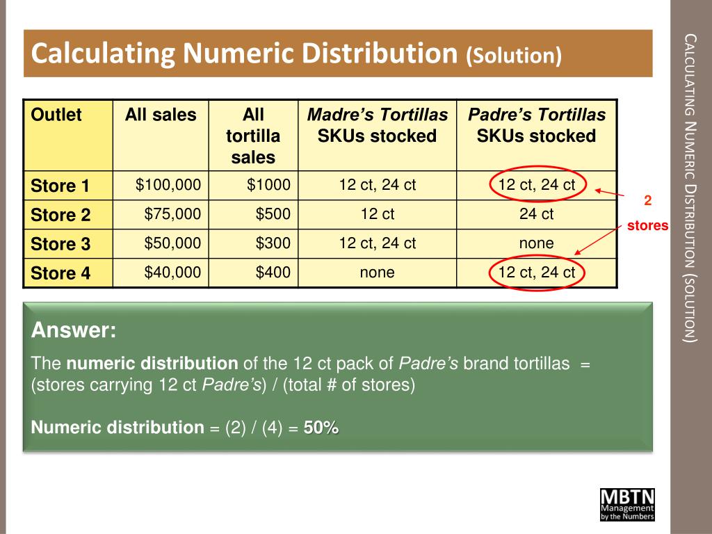 Calculating Numeric Distribution (Solution) Calculating Numeric Distribution (solution) 2 stores Answer: The numeric distribution of the 12 ct pack of Padre’s brand tortillas = (stores carrying 12 ct Padre’s) / (total # of stores) Numeric distribution = (2) / (4) = 50%