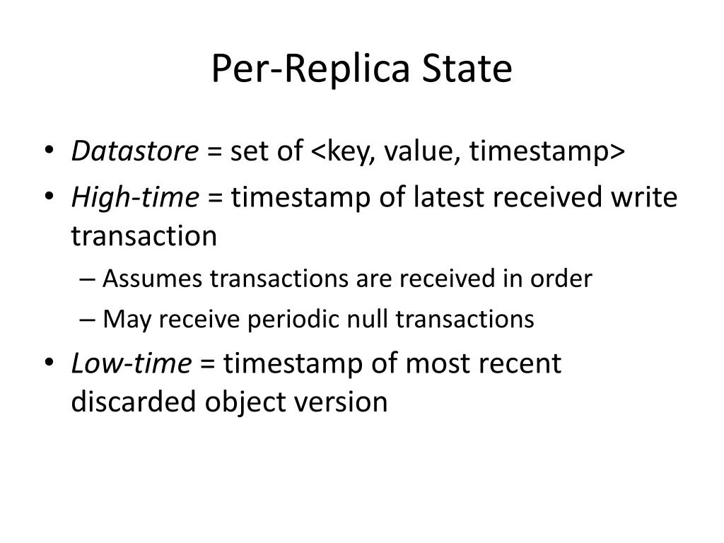 Per-Replica State • Datastore = set of <key, value, timestamp> • High-time = timestamp of latest received write transaction • Assumes transactions are received in order • May receive periodic null transactions • Low-time = timestamp of most recent discarded object version