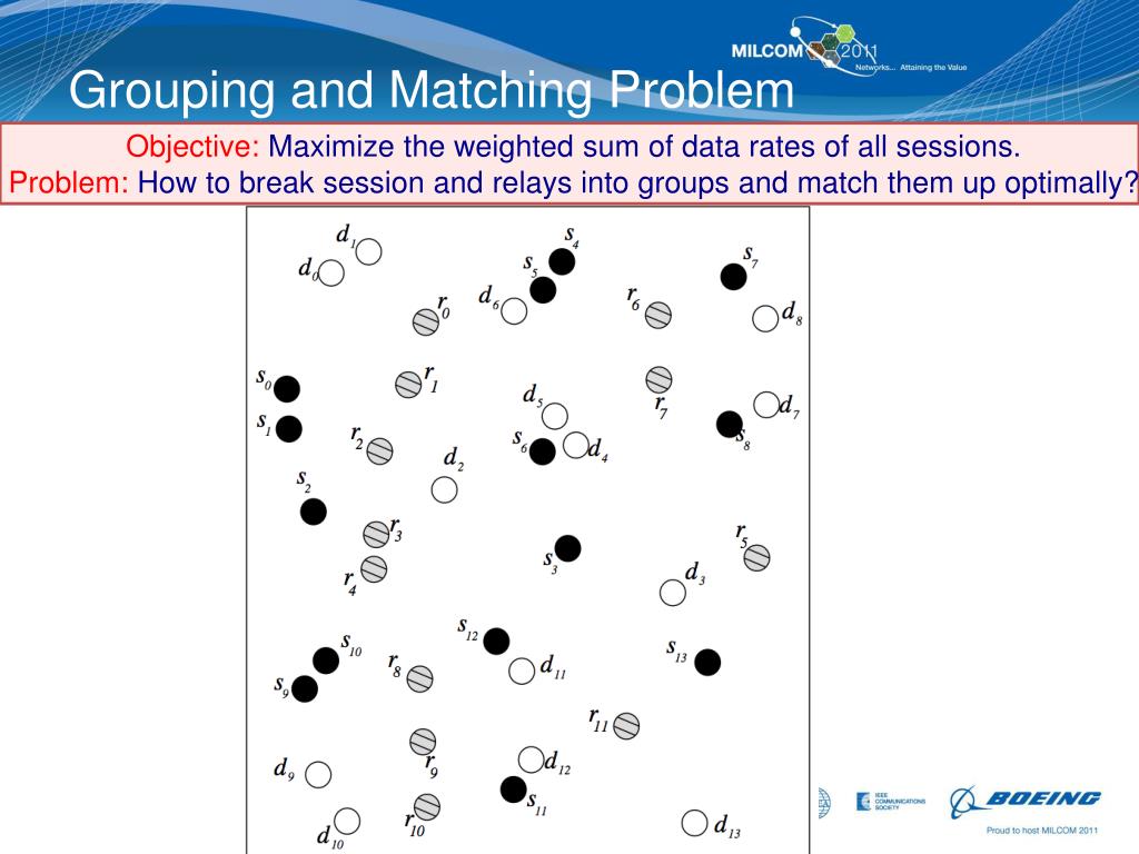 Grouping and Matching Problem Objective:Maximize the weighted sum of data rates of all sessions. Problem:How to break session and relays into groups and match them up optimally?