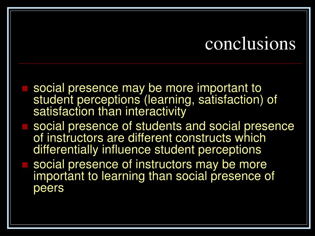 conclusions • social presence may be more important to student perceptions (learning, satisfaction) of satisfaction than interactivity • social presence of students and social presence of instructors are different constructs which differentially influence student perceptions • social presence of instructors may be more important to learning than social presence of peers