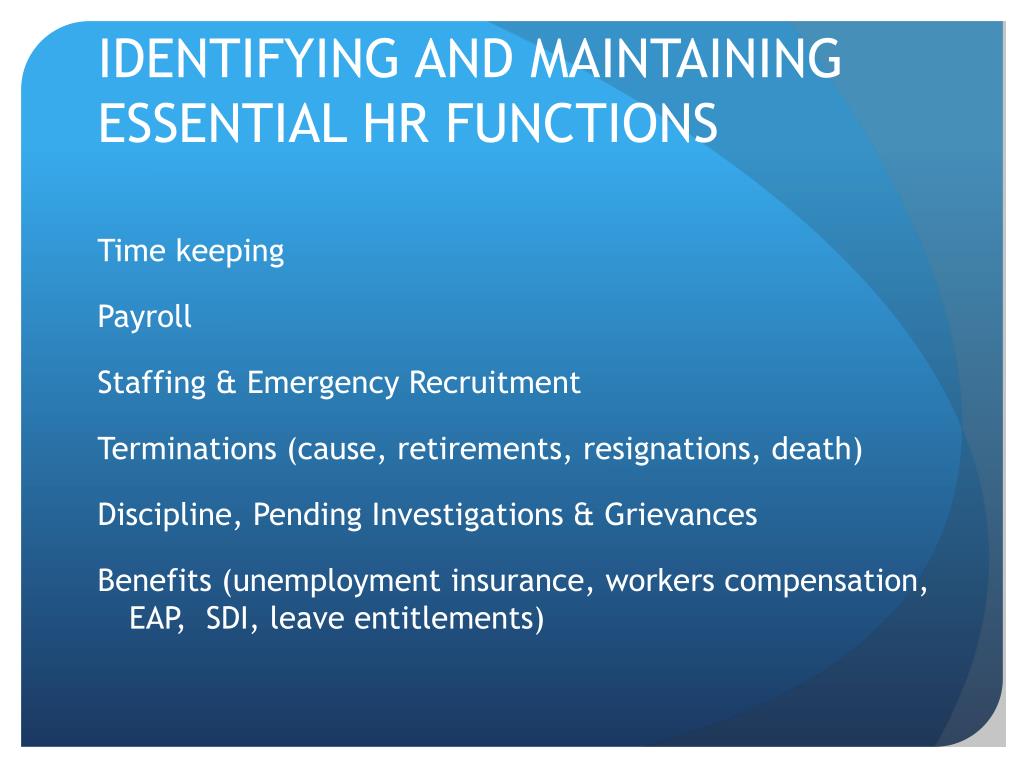IDENTIFYING AND MAINTAININGESSENTIAL HR FUNCTIONS Time keeping Payroll Staffing & Emergency Recruitment Terminations (cause, retirements, resignations, death) Discipline, Pending Investigations & Grievances Benefits (unemployment insurance, workers compensation, EAP, SDI, leave entitlements)