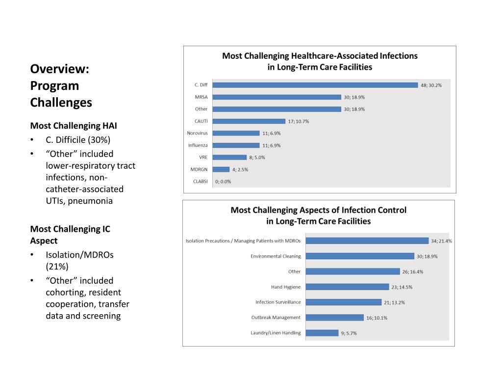 Overview: Program Challenges Most Challenging HAI C. Difficile (30%) “Other” included lower-respiratory tract infections, non-catheter-associated UTIs, pneumonia Most Challenging IC Aspect Isolation/MDROs (21%) “Other” included cohorting, resident cooperation, transfer data and screening Assessment Survey: Infection Control Policies in Connecticut LTCFs, June 2012