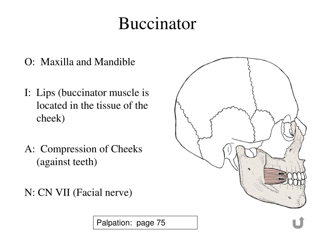Buccinator O: Maxilla and Mandible I: Lips (buccinator muscle is located in the tissue of the cheek) A: Compression of Cheeks (against teeth) N: CN VII (Facial nerve) Palpation: page 75