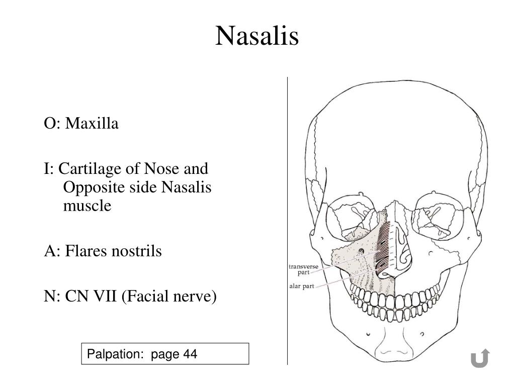 Nasalis O: Maxilla I: Cartilage of Nose and Opposite side Nasalis muscle A: Flares nostrils N: CN VII (Facial nerve) Palpation: page 44