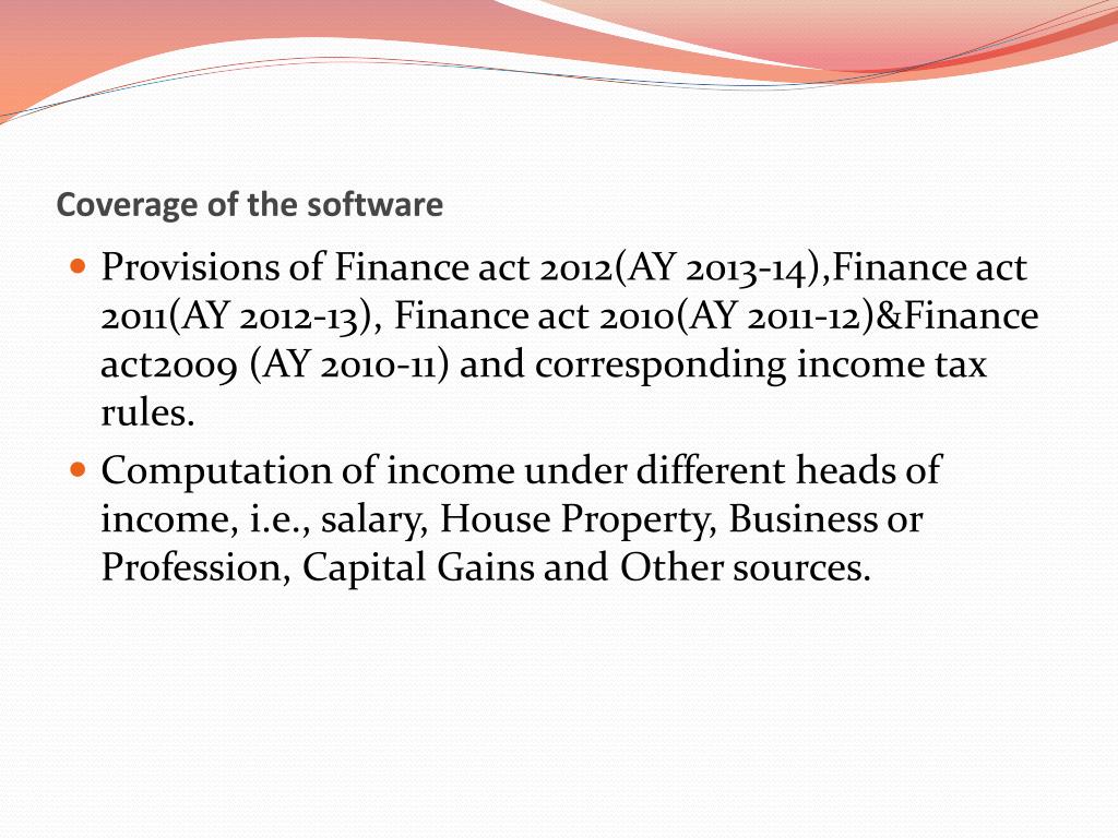 Coverage of the software • Provisions of Finance act 2012(AY 2013-14),Finance act 2011(AY 2012-13), Finance act 2010(AY 2011-12)&Finance act2009 (AY 2010-11) and corresponding income tax rules. • Computation of income under different heads of income, i.e., salary, House Property, Business or Profession, Capital Gains and Other sources.