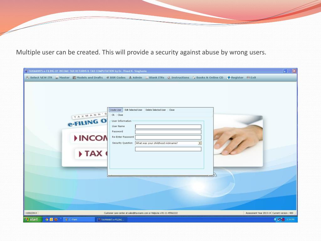 Benefit of the software • Incorporating model and draft facility. • Incorporating XML validation/creation for e-filing of income tax return(i.e., ITR-1 to ITR-6) • Master data import from any software generated XML.