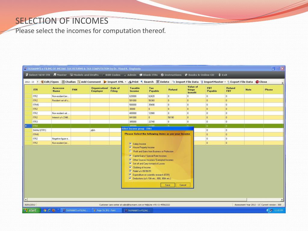 SELECTION OF INCOMESPlease select the incomes for computation thereof.