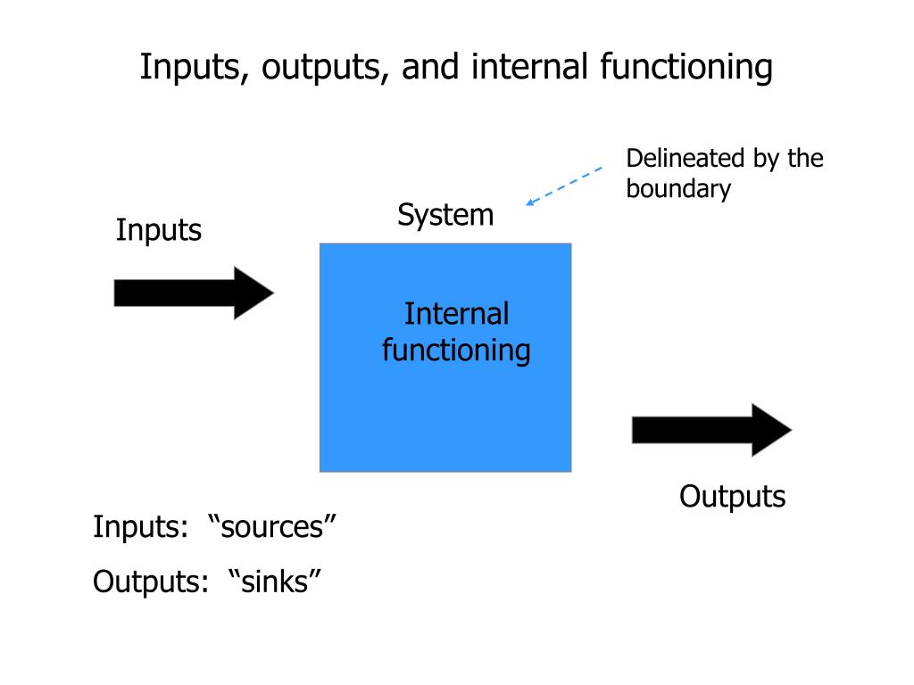 Inputs, outputs, and internal functioning Delineated by the boundary System Inputs Internal functioning Outputs Inputs: “sources” Outputs: “sinks”