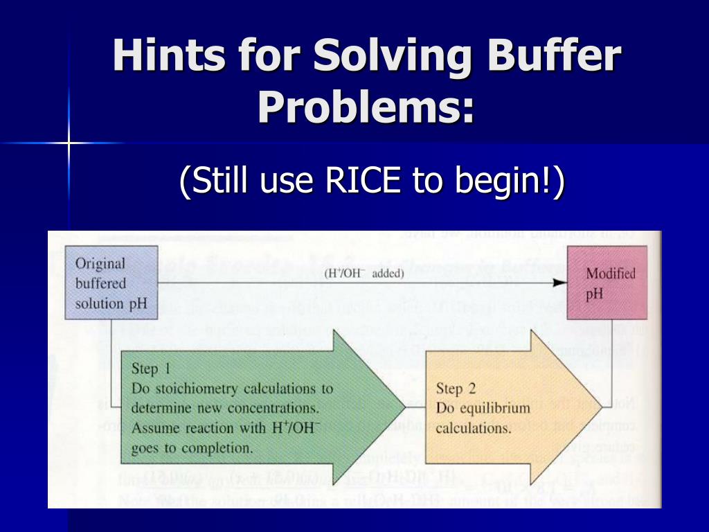 Write equilibrium equation. Set up equilibrium expression (Ka or Kb) or HH equation. Solve. Check logic of answer.