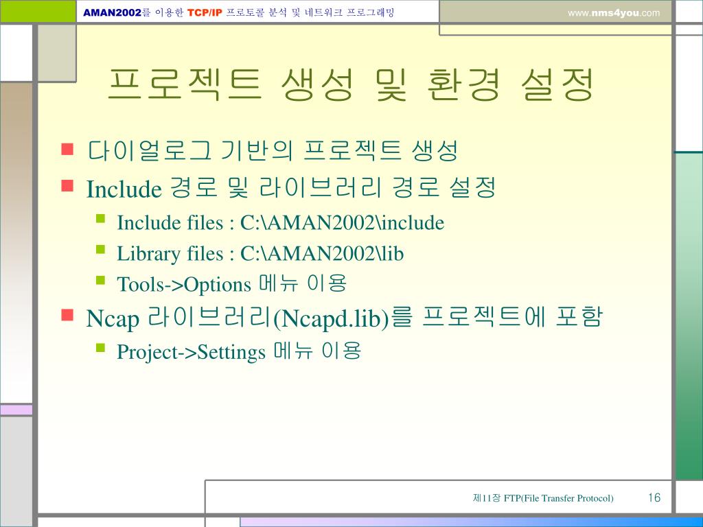 프로젝트 생성 및 환경 설정 • 다이얼로그 기반의 프로젝트 생성 • Include 경로 및 라이브러리 경로 설정 • Include files : C:\AMAN2002\include • Library files : C:\AMAN2002\lib • Tools->Options 메뉴 이용 • Ncap 라이브러리(Ncapd.lib)를 프로젝트에 포함 • Project->Settings 메뉴 이용