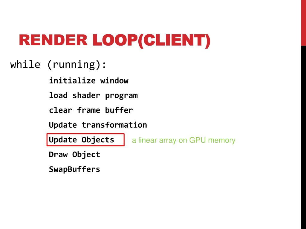Render Loop(client) while (running): a linear array onGPU memory initialize window load shader program clear frame buffer Update transformation Update Objects Draw Object SwapBuffers