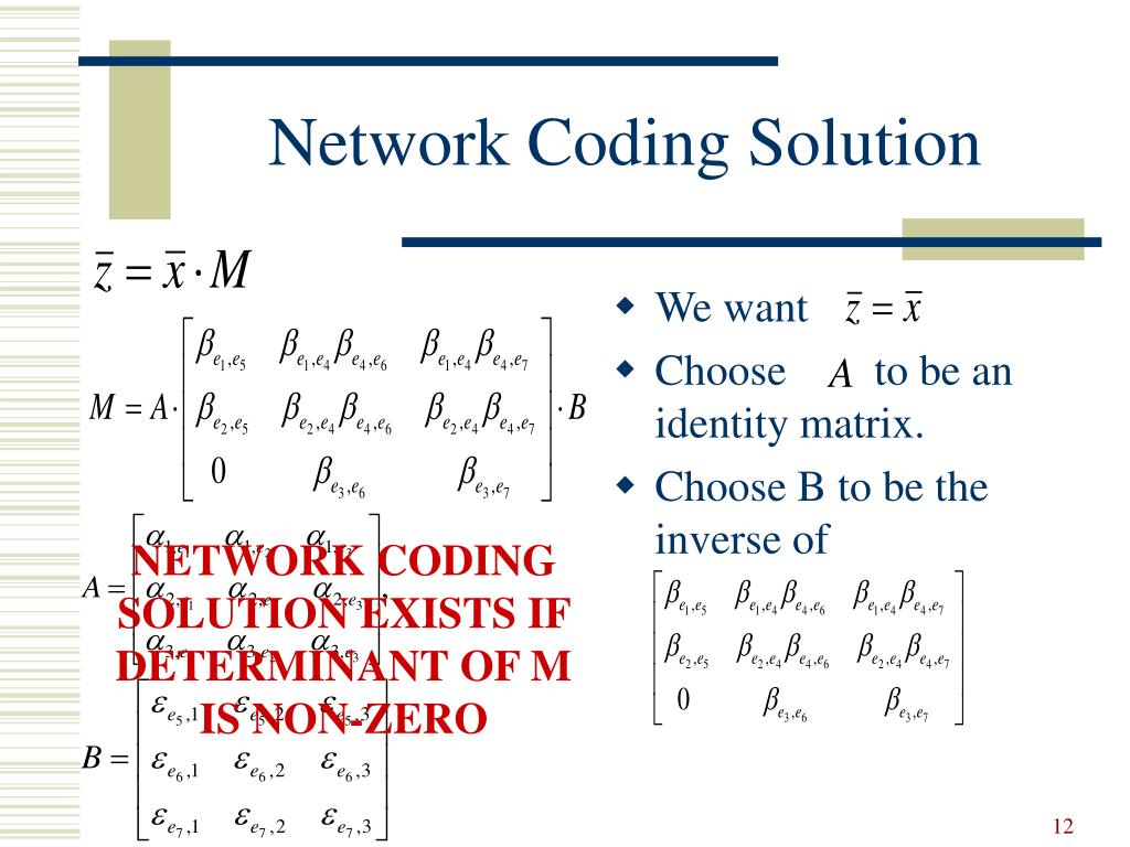 Network Coding Solution • We want • Choose to be an identity matrix. • Choose B to be the inverse of NETWORK CODING SOLUTION EXISTS IF DETERMINANT OF M IS NON-ZERO