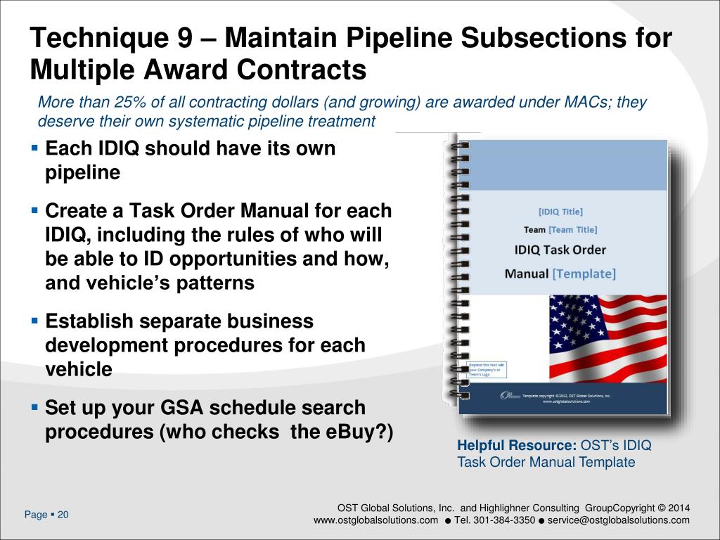 Technique 9 – Maintain Pipeline Subsections for Multiple Award Contracts • More than 25% of all contracting dollars (and growing) are awarded under MACs; they deserve their own systematic pipeline treatment • Each IDIQ should have its own pipeline • Create a Task Order Manual for each IDIQ, including the rules of who will be able to ID opportunities and how, and vehicle’s patterns • Establish separate business development procedures for each vehicle • Set up your GSA schedule search procedures (who checks the eBuy?) Helpful Resource: OST’s IDIQ Task Order Manual Template