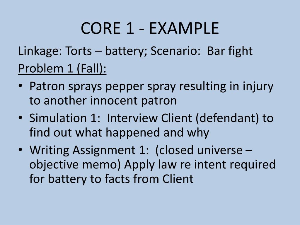 CORE 1 - EXAMPLE Linkage: Torts – battery; Scenario: Bar fight Problem 1 (Fall): • Patron sprays pepper spray resulting in injury to another innocent patron • Simulation 1: Interview Client (defendant) to find out what happened and why • Writing Assignment 1: (closed universe – objective memo) Apply law re intent required for battery to facts from Client